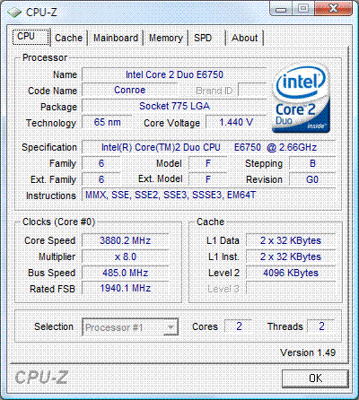 | Разгон, максимально стабильная частота (FSB x Ratio) | 3880 (485 x 8.0) |