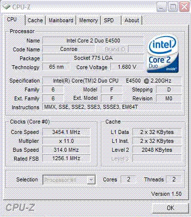 | Разгон, максимально стабильная частота (FSB x Ratio) | 3454 (314 x 11.0) |
