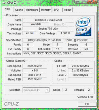 | Разгон, максимально стабильная частота (FSB x Ratio) | 3686 (388 x 9.5) |