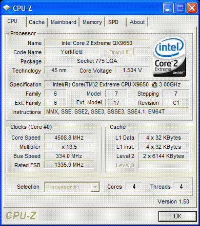 | Разгон, максимально стабильная частота (FSB x Ratio) | 4509 (334 x 13.5) |