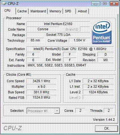 | Разгон, максимально стабильная частота (FSB x Ratio) | 3429 (381 x 9.0) |