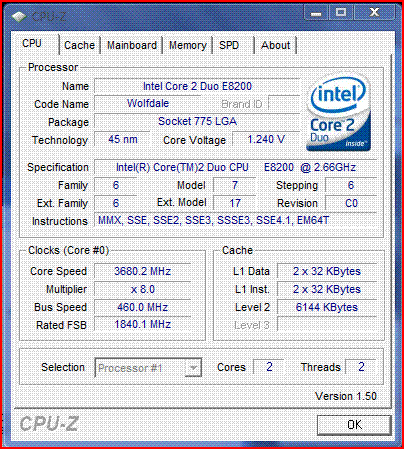 | Разгон, максимально стабильная частота (FSB x Ratio) | 3680 (460 x 8.0) |