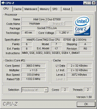 | Разгон, максимально стабильная частота (FSB x Ratio) | 3663 (333 x 11.0) |