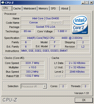 | Разгон, максимально стабильная частота (FSB x Ratio) | 3330 (333 x 10.0) |