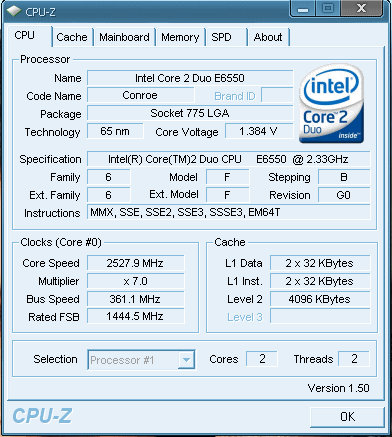 | Разгон, максимально стабильная частота (FSB x Ratio) | 2527 (361 x 7.0) |