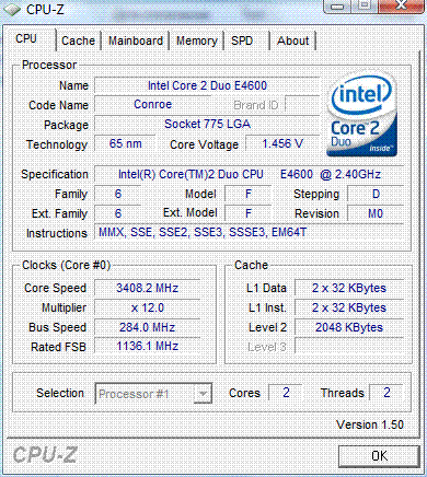 | Разгон, максимально стабильная частота (FSB x Ratio) | 3408 (284 x 12.0) |