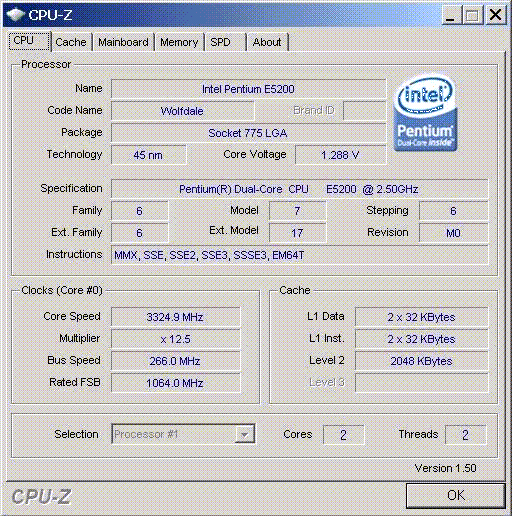 | Разгон, максимально стабильная частота (FSB x Ratio) | 3325 (266 x 12.5) |
