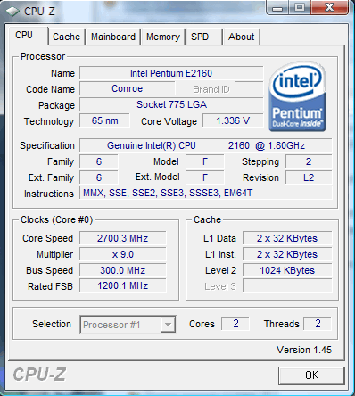 | Разгон, максимально стабильная частота (FSB x Ratio) | 2700 (300 x 9.0) |