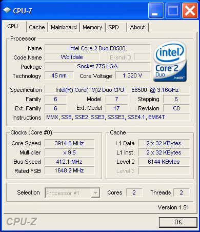 | Разгон, максимально стабильная частота (FSB x Ratio) | 3914 (412 x 9.5) |