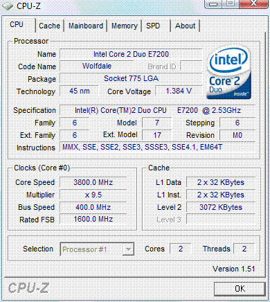 | Разгон, максимально стабильная частота (FSB x Ratio) | 3800 (400 x 9.5) |