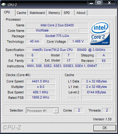 | Разгон, максимально стабильная частота (FSB x Ratio) | 4401 (489 x 9.0) |