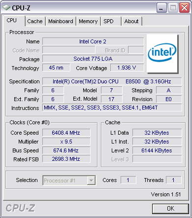 | Разгон, максимально стабильная частота (FSB x Ratio) | 6403 (674 x 9.5) |