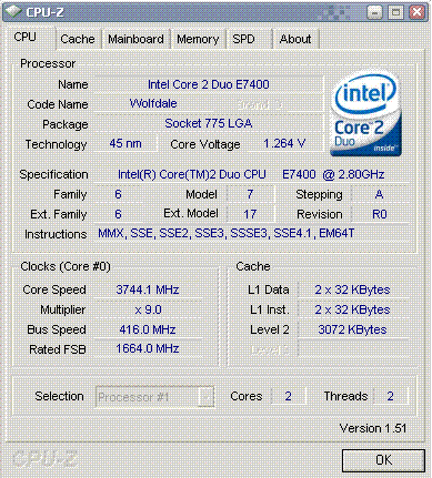| Разгон, максимально стабильная частота (FSB x Ratio) | 3744 (416 x 9.0) |