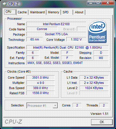 | Разгон, максимально стабильная частота (FSB x Ratio) | 3501 (389 x 9.0) |