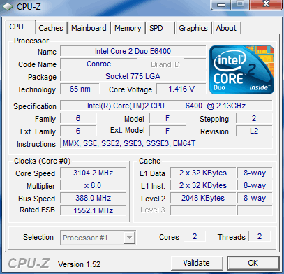 | Разгон, максимально стабильная частота (FSB x Ratio) | 3104 (388 x 8.0) |