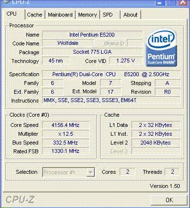 | Разгон, максимально стабильная частота (FSB x Ratio) | 4162 (333 x 12.5) |