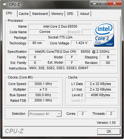 Разогнался очень просто, почти на автомате (в биосе только поставил FSB 500, а остальное материнка сделала сама), потенциалу ещё выше крыши. Как поставлю кулер не боксовый да и слезу с оперативки убогой (одна планка 2 Гб, кингстон, 800Мгц) так разгоню ещё выше. В данный момент тайминги 6-6-6-18, частота 500 - из CPU-Z.