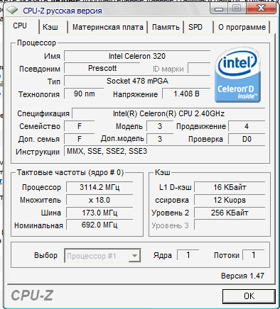 | Процессор (ядро) | Intel Celeron D (Prescott-256) |