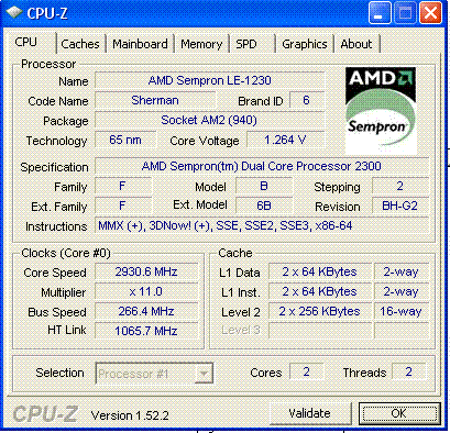 На самом деле Sempron X2 2300 (Brisbane-256). Напряжение номинал, на большем гонится еще, но кулер уже не выдерживает.
