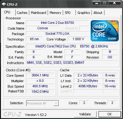 | Разгон, максимально стабильная частота (FSB x Ratio) | 3680 (460 x 8.0) |