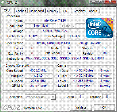 | Разгон, максимально стабильная частота (FSB x Ratio) | 4305 (205 x 21.0) |