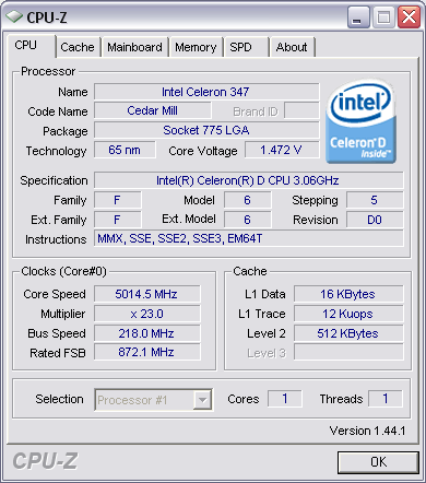 Результат разгона Intel Celeron D (CedarMill-512)