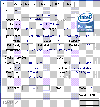 | Разгон, максимально стабильная частота (FSB x Ratio) | 3192 (266 x 12.0) |