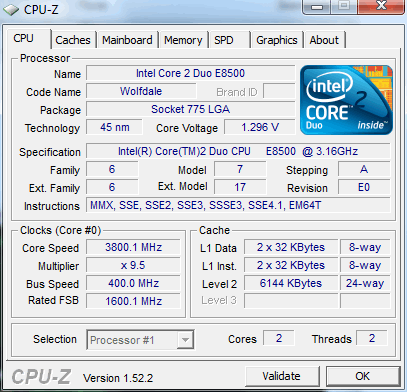 | Разгон, максимально стабильная частота (FSB x Ratio) | 3800 (400 x 9.5) |