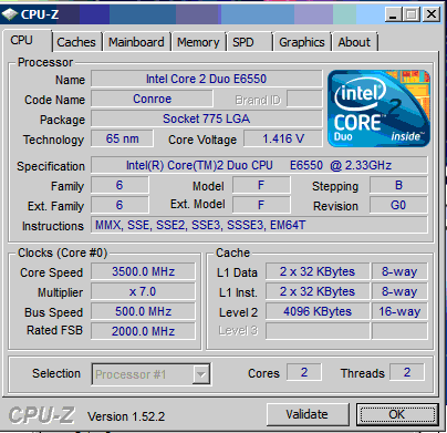 | Разгон, максимально стабильная частота (FSB x Ratio) | 3500 (500 x 7.0) |
