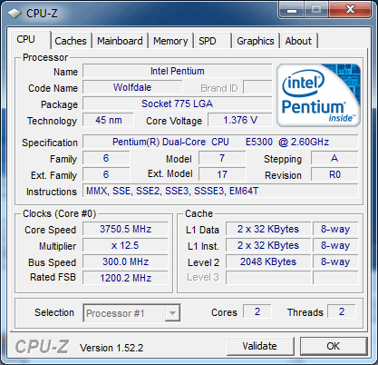 | Разгон, максимально стабильная частота (FSB x Ratio) | 3750 (300 x 12.5) |
