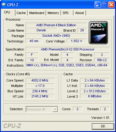Phenom II X2 550 BE.Работает стабильно CPU 4052 MHz,память DDR2 Dual 953,4 MHz тайминги 5-4-4-11-19-2T.PCMark05 v.1.2.0 CPU - 9281,Memory - 7991. LinX ~ 20 ГФлопс