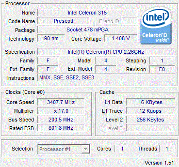 | Процессор (ядро) | Intel Celeron D (Prescott-256) |