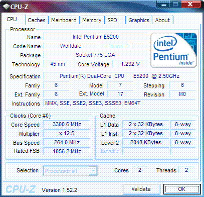 | Разгон, максимально стабильная частота (FSB x Ratio) | 3300 (264 x 12.5) |