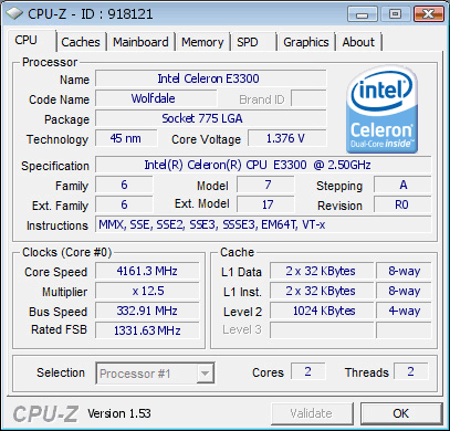 На самом деле это Celeron E3300, просто в списке выбора его нет... разгон не максимальный, лень пока мучать, два ядра по 4160 и так хватает за глаза :-)