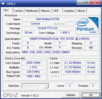 | Разгон, максимально стабильная частота (FSB x Ratio) | 3250 (325 x 10.0) |