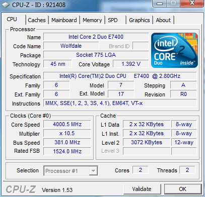 | Разгон, максимально стабильная частота (FSB x Ratio) | 4000 (381 x 10.5) |