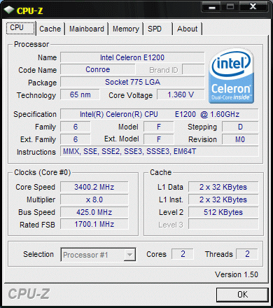| Разгон, максимально стабильная частота (FSB x Ratio) | 3400 (425 x 8.0) |