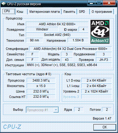 | Процессор (ядро) | AMD Athlon 64 X2 (Windsor) |