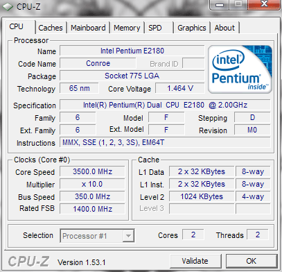 | Разгон, максимально стабильная частота (FSB x Ratio) | 3500 (350 x 10.0) |