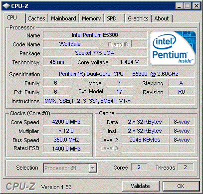 | Разгон, максимально стабильная частота (FSB x Ratio) | 4200 (350 x 12.0) |