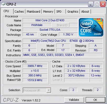 | Разгон, максимально стабильная частота (FSB x Ratio) | 3990 (380 x 10.5) |