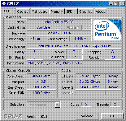 | Разгон, максимально стабильная частота (FSB x Ratio) | 4050 (300 x 13.5) |