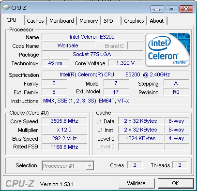 | Разгон, максимально стабильная частота (FSB x Ratio) | 3504 (292 x 12.0) |