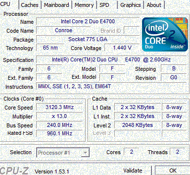 | Разгон, максимально стабильная частота (FSB x Ratio) | 3120 (240 x 13.0) |