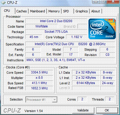 | Разгон, максимально стабильная частота (FSB x Ratio) | 3304 (413 x 8.0) |