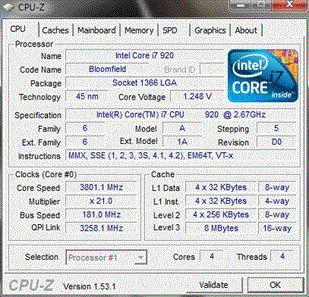| Разгон, максимально стабильная частота (FSB x Ratio) | 3801 (181 x 21.0) |