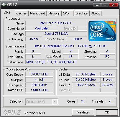 | Разгон, максимально стабильная частота (FSB x Ratio) | 3780 (360 x 10.5) |