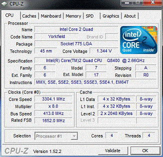 | Разгон, максимально стабильная частота (FSB x Ratio) | 3304 (413 x 8.0) |