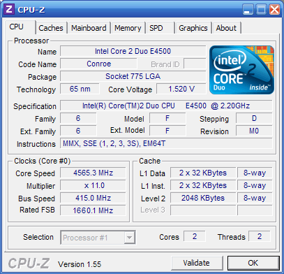 | Разгон, максимально стабильная частота (FSB x Ratio) | 4565 (415 x 11.0) |