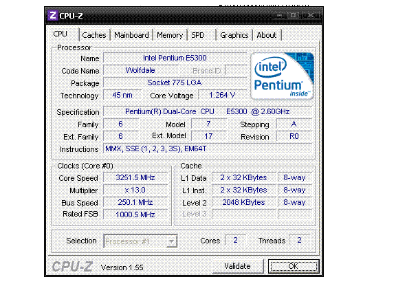 | Разгон, максимально стабильная частота (FSB x Ratio) | 3250 (250 x 13.0) |